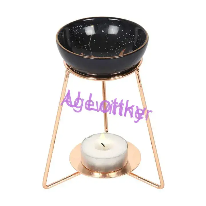 Tato jedinečná aromalampa a ohřívač vosku obsahuje úžasnou keramickou misku se zlatými nebeskými akcenty a odpovídající zlatou kovovou základnou. Umístěte pod něj jednu čajovou svíčku a vytvořte kouzelnou atmosféru ve spojení s taveným voskem nebo vonným olejem.