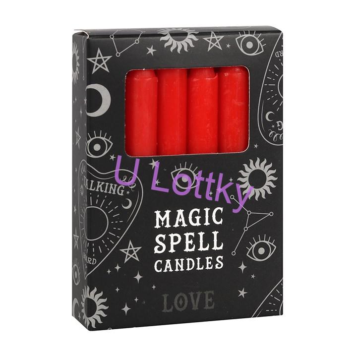 Balení 12 červených kouzelných svíček pro použití s rituály k přilákání lásky, sexu a vitality.