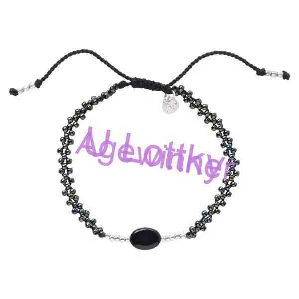 Tento náramek Emotion Black Onyx Silver Colored Colored A Beautiful Story je vyroben z mosazi, skleněných korálků, jednoho černého drahokamu onyxu a má bavlněnou nit s nastavitelným posuvným uzlem.