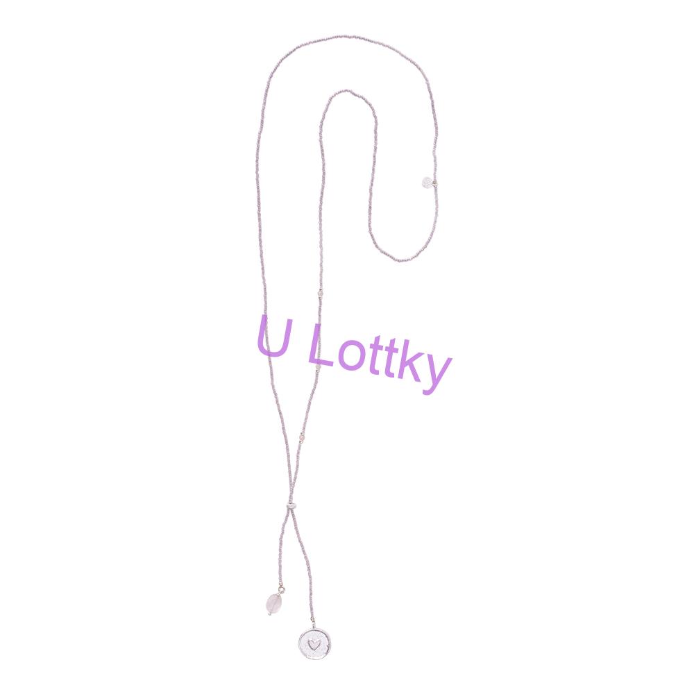 Náhrdelník se dělí na dva konce. Na jednom konci velký přívěsek z drahokamu růženín a na druhém konci postříbřená mince se symbolem srdce. S délkou 80 centimetrů náhrdelník krásně padne každému.