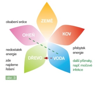 Ještě máme další skupinu onemocnění. Neprojevují se tak bouřlivě, ale obtěžují naše zvíře dlouhou dobu. V tomto případě se jedná o nedostatek energie prvku a blok se nachází na prvku předchozím. Jako příklad si uveďme oslabení srdce (obr. 3).